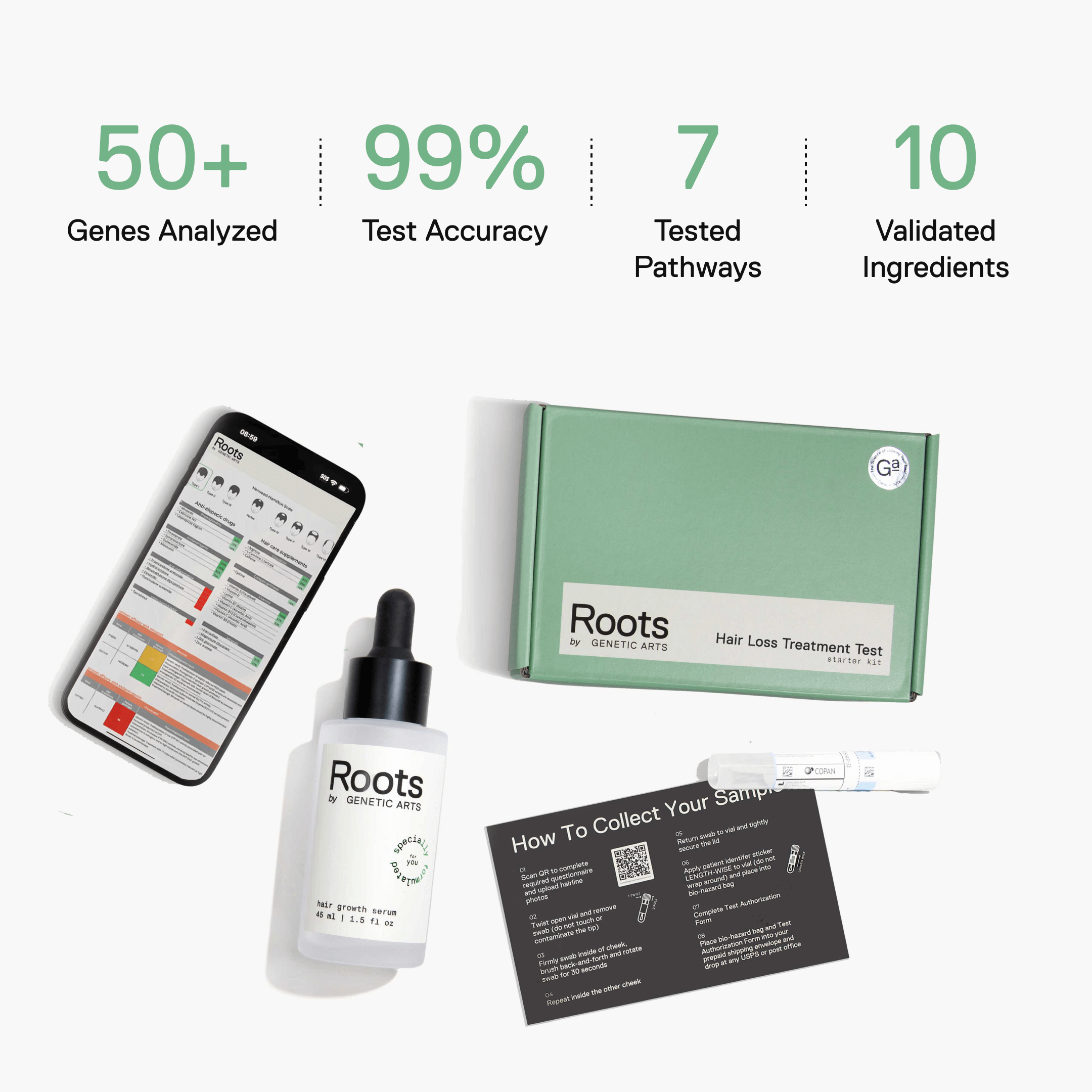 A genetic test provides valuable insights into how your unique genetic makeup may influence hair loss and your response to different treatments. By analyzing over 20 specific genes and biomarkers related to hair health, we can understand underlying factors contributing to hair thinning or loss. This allows us to personalize your treatment with ingredients that are more likely to work effectively for you. With a tailored approach, you’re not only improving your chances of seeing results but also minimizing exposure to ingredients that may be less beneficial for your hair type and genetic profile.