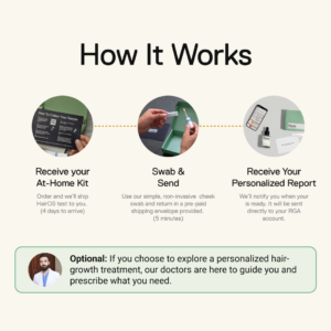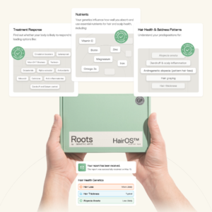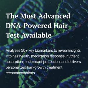 Analyzes 11 nutrient plus scalp traits and 5 major hair markers including hormonal and other forms of hair loss risk, dandruff, thickness, and graying. A quick saliva swab gives you a lab-grade, personalized report.